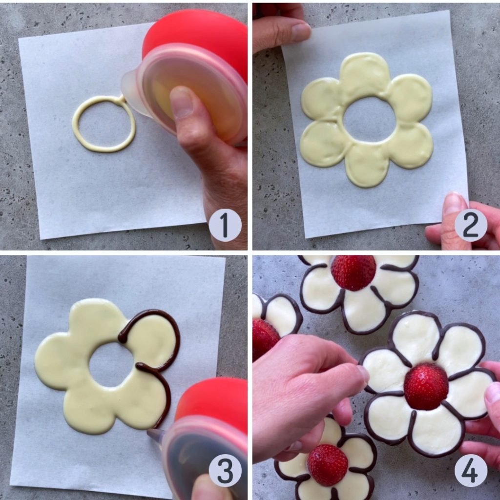 • Color the chocolate: Tint the white chocolate with pink pitaya powder or freeze-dried strawberry powder for a pink-colored flower.