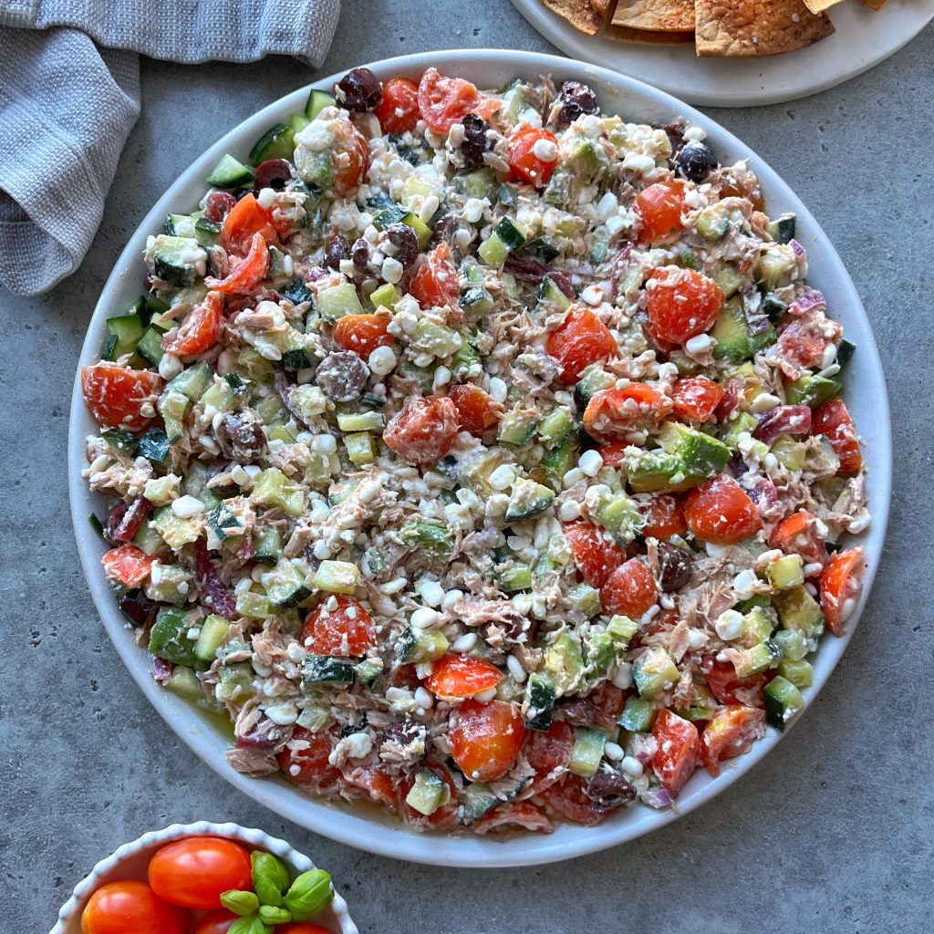 This tuna and cottage cheese salad is a fun, Mediterranean twist on a classic dish. Colorful, bright, and savory, it’s crisp, creamy, and quick to make!
